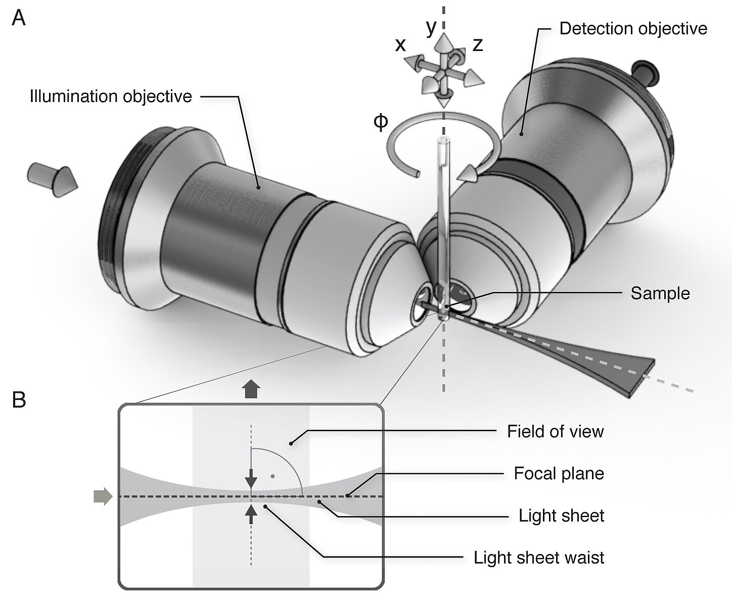 旋转样本在某些场景下可能大有裨益。通常,研究人员希望能够从正确的角度(侧视图、俯视图等)对样本成像,或者希望仅从特定角度对可见的器官(例如心脏)成像。旋转的另一个重要应用是从多个角度记录z向堆叠的所谓多视角成像,例如 6个覆盖360度的角度,然后融合每个数据集的有用部分以生成一个覆盖整个样本的3D图像。这对于较大的样本尤为有用,因为样本本身会散射、折射并吸收光,从而影响样本内部深层结构的照明和检测质量。因此,需使用多个角度来捕获所有细节。