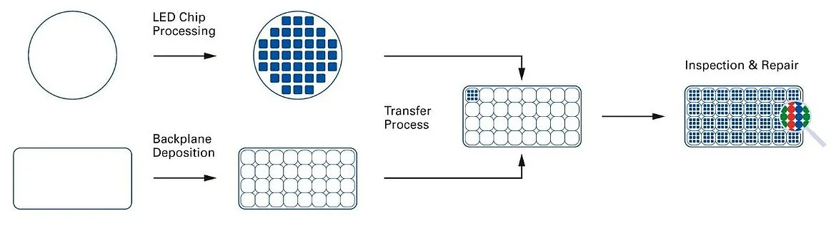 生产一个4K显示屏需要约2500万颗微发光二极体,每颗都需要以亚微米精度从供体晶圆转移到TFT背板。 即使缺陷率仅为0.01%,也会导致每个面板上出现数百个故障芯片。 因此,制造商不仅需要高速转移技术,还需具备稳健的缺陷像素修复能力。