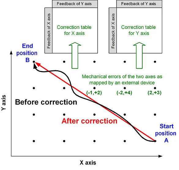- 误差插补: 通过创建并上传至运动控制器的校正曲线,识别、记录和补偿运动系统中的系统误差,以提高定位精度的过程。 误差插补通常采用激光干涉仪等外部精密仪器来完成。