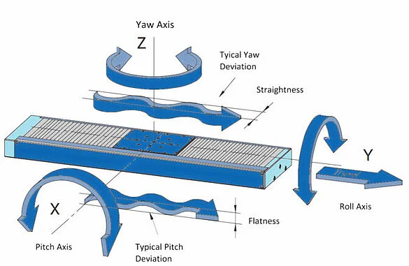 - 螺距(倾斜): 在线性平台中,定位对象在纯水平平移过程中产生“上下”(倾斜)运动的非预期趋势。