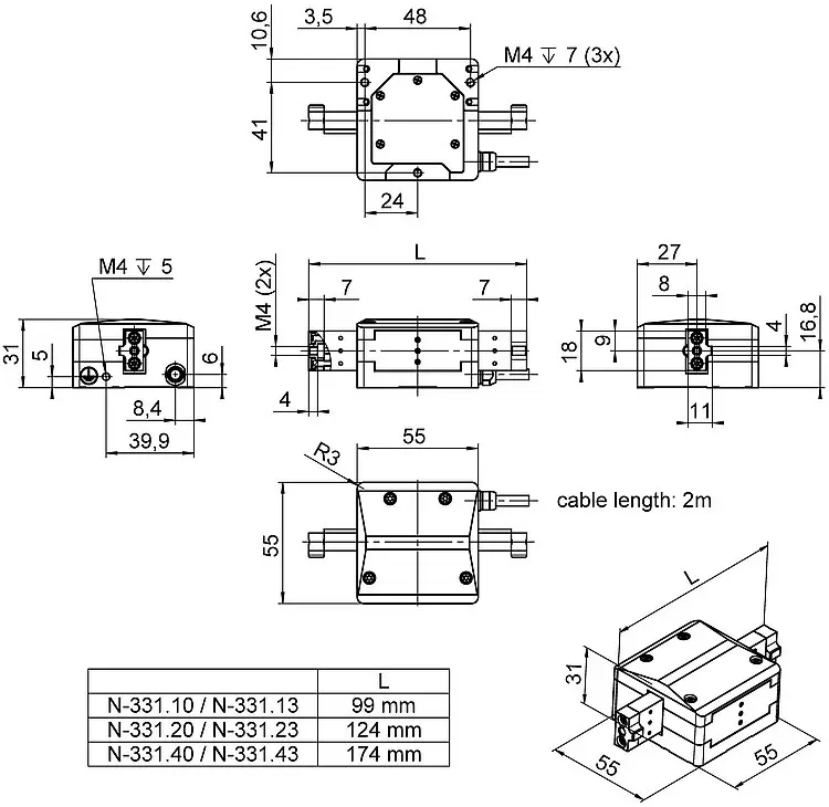 行程(步进模式,开环)* | N-331.1x:30 N-331.2x:55 N-331.4x:105 | 毫米 | ±0.5 毫米 |