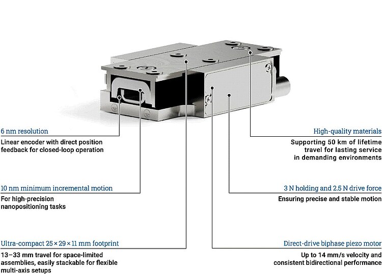 BIX miniature linear stage, piezoelectric inertia drive, 13 mm travel range, linear encoder, 6 nm resolution, 2.5 N drive force, dimensions 25 × 29 × 11 mm (L × W × H)