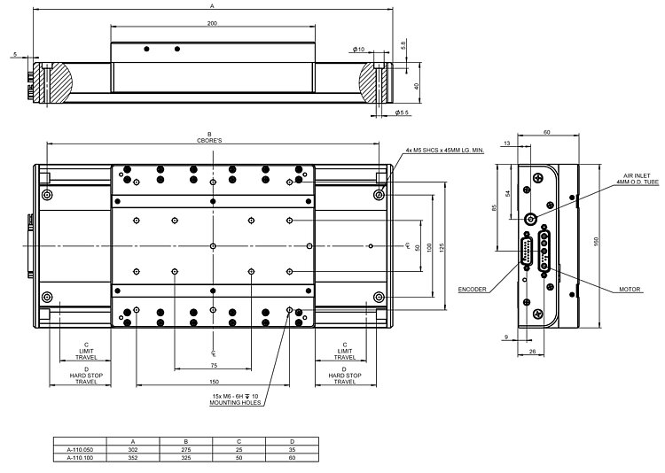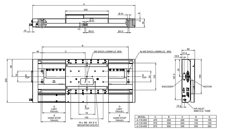 PIglideLC线性平台,空气轴承,200毫米行程,增量带正弦/余弦信号传输的线性编码器,20微米传感器信号周期,无铁芯三相线性电机,48伏