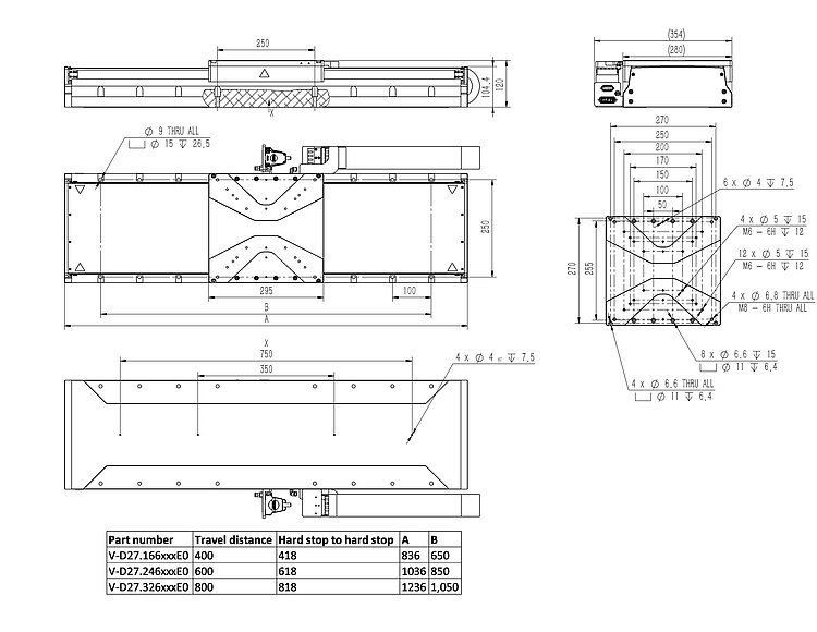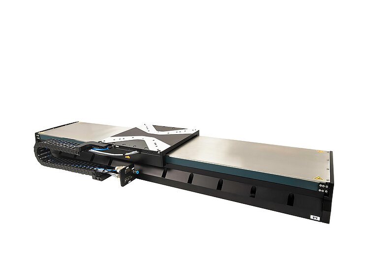 高负载线性平台,无铁芯三相直线电机,宽度为280mm,行程为800mm,负载能力为1500N,最大速度3000mm/s,带正弦/余弦信号传输的增量直线光栅尺,信号周期为20µm,1Vpp。