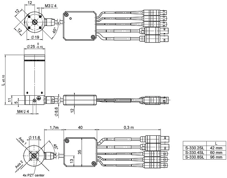 快速压电偏摆台;2mrad × 2mrad旋转角(θX×θY);SGS,间接位置测量;Sub-D37 接头(公);电缆长度为2m