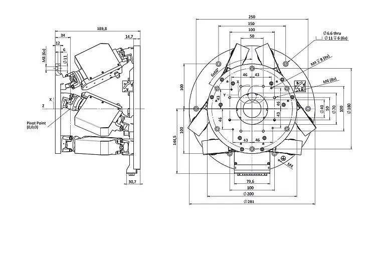 * 单个坐标(X、Y、Z、θX、θY和θZ)的行程相互依赖。本表中各轴对应的数值为其最大行程,此时其他轴和枢轴点位于参考位置。