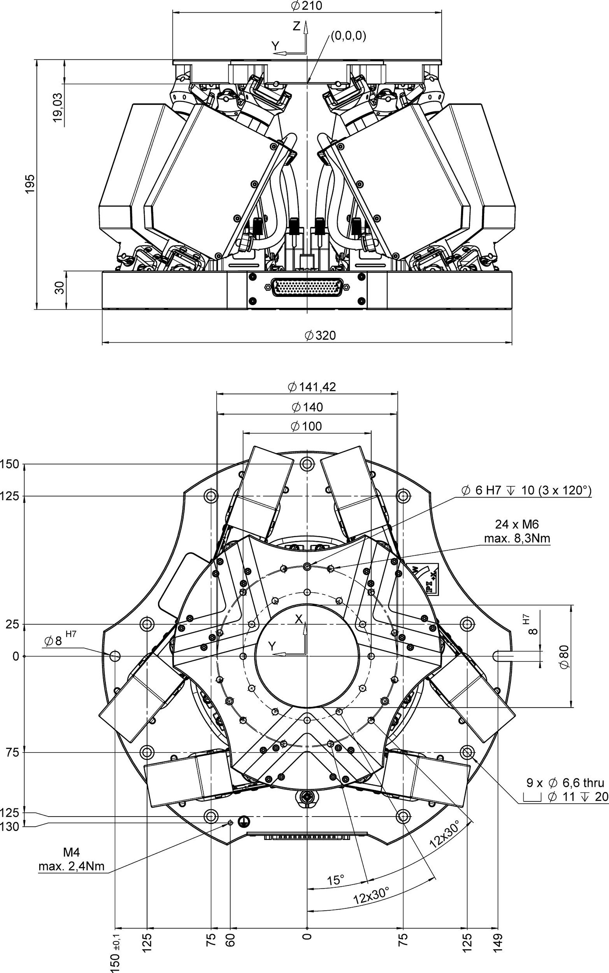 紧凑型六足位移台;无刷直流齿轮电机;绝对编码器;有效载荷为30kg;最大速度为2.5mm/s。 连接电缆不包含在发货范围内,需单独订购。
