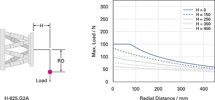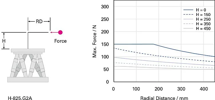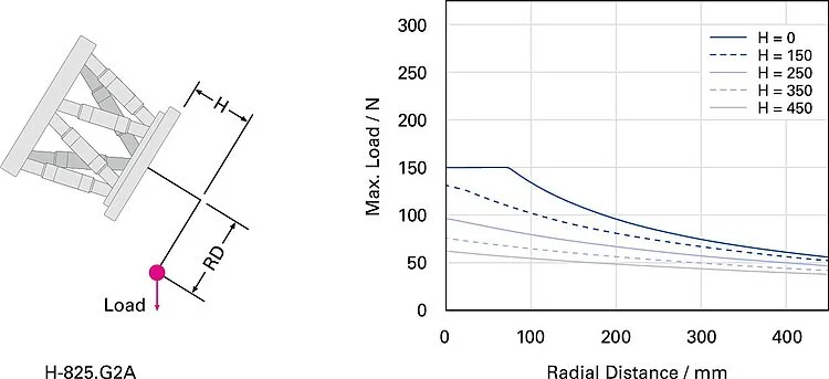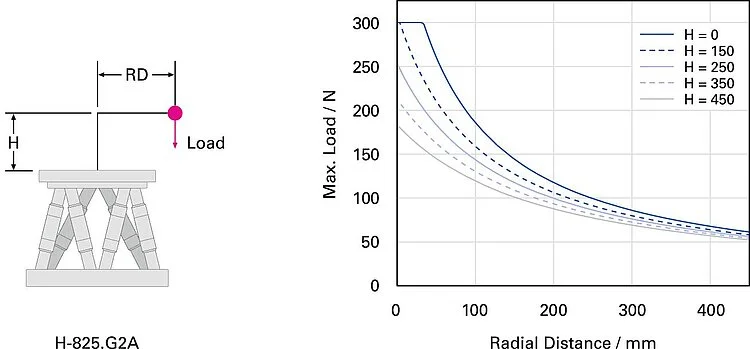 该仿真软件可模拟六足位移台的工作区和有效载荷的限值。 因此,在购买之前,您即可验证特定的六足位移台型号是否可以应对应用中出现的负载、力和力矩。 为此,该仿真工具综合考虑了六足位移台的位置和运动,以及枢轴点和多个参考坐标系。