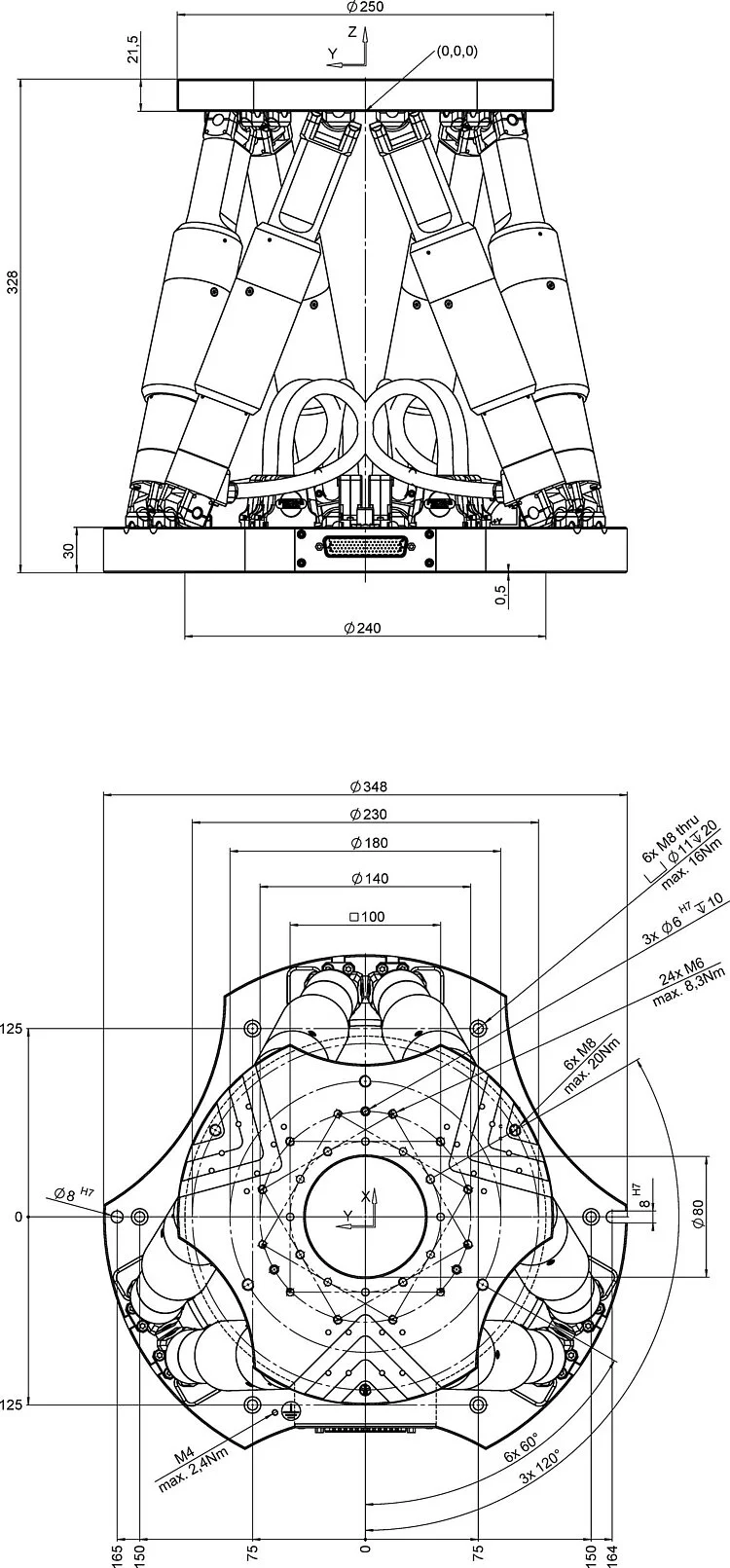 精密六足位移台;无刷直流齿轮电机;绝对编码器;有效载荷为250kg;最大速度为0.5mm/s。 连接电缆不包含在发货范围内,需单独订购。