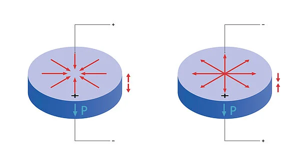 作为促动器使用时,压电陶瓷片会在施加电压时产生机械位移。 该位移可表现为直流电作用下的静态变形,或交流电作用下的振荡(例如在超声波频段)。 根据压电元件设计的不同,运动可沿纵向或径向发生。 偏转幅度由压电陶瓷片的尺寸和所施加电压共同决定。