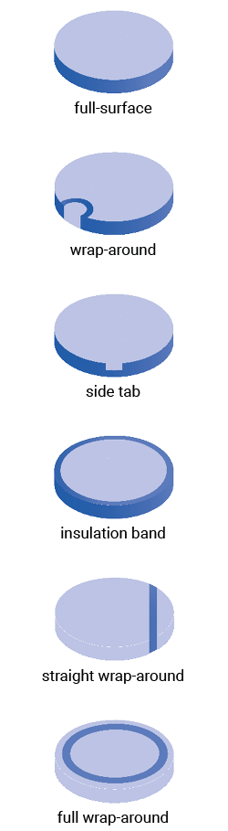 | 电极设计 | 多种设计可选:全表面电极、环绕式电极、侧边焊片电极、绝缘带电极、直绕式电极、全环绕式电极(参见右栏) |