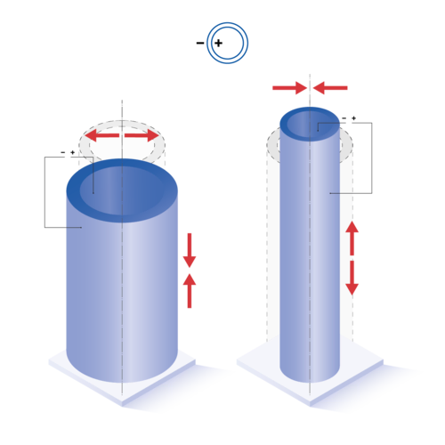 当压电陶瓷管用作促动器时,施加电压会引起机械形变。 这种形变可表现为直流电压驱动的静态变形,或交流电压驱动的振荡运动(如超声波频段)。 根据压电元件的设计差异,运动模式可分为轴向或横向。 形变幅度同时受压电管尺寸和施加电压值的影响。