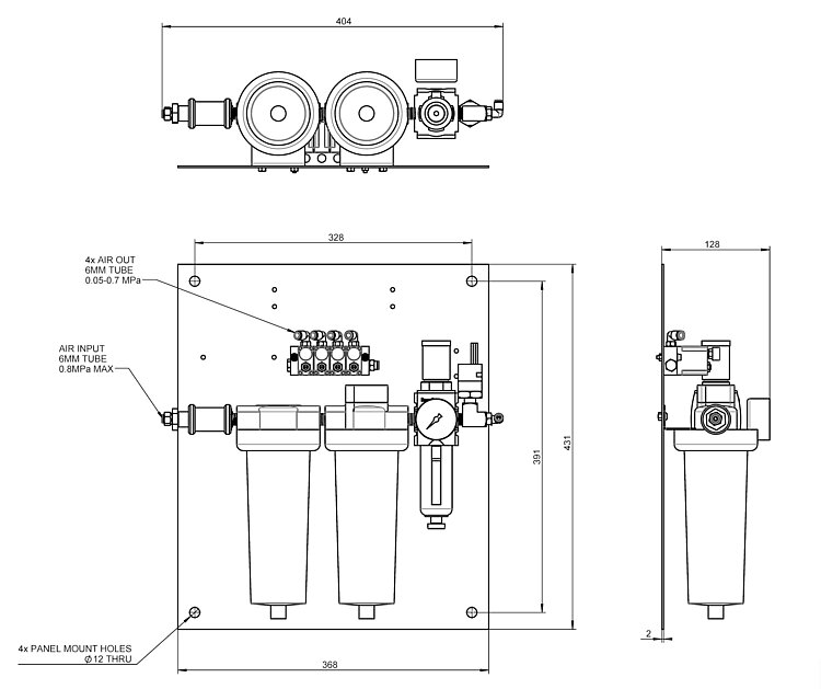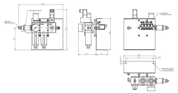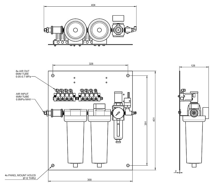 A-804型号基于A-801型号或A-802型号,并预先配置了用于4或8个独立调节的压力通道的多轴空气分配器。此外,A-804型号提供时完全组装在钢板上。