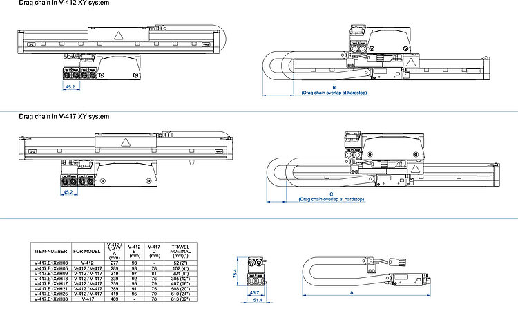 Regardless of the travel range of the Y axis, the V-417.E1XYHxx drag chain must be selected for the travel range of the X axis.