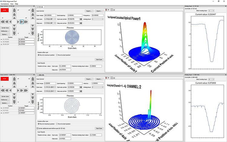PI FA1对准工具,用于对准光电器件的软件;用于与C-884控制器(用于电动轴)和带有快速对准程序(螺旋区域扫描)的E-727.AS控制器(用于带有应变片传感器的压电轴)一起使用。