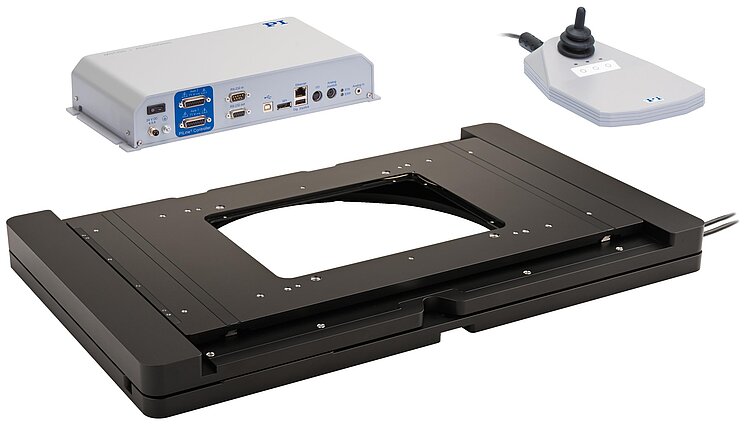 System consisting of U-781.NOZL XY stage, controller, and USB joystick. Large clear aperture 160 mm × 110 mm.